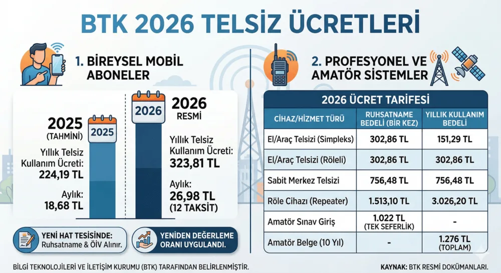 Bilgi Teknolojileri ve İletişim Kurumu (BTK) tarafından belirlenen ve 1 Ocak 2026 tarihinden itibaren geçerli olan telsiz ücretleri, bir önceki yıla göre yeniden değerleme oranında artırılmıştır. Bu ücretler, hem bireysel mobil (cep telefonu) abonelerini hem de profesyonel/amatör telsiz sistemlerini kullanan kurum ve kişileri kapsamaktadır.